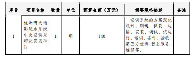 杭州湾大通影院水系统中央空调采购及安装项目招标公告
